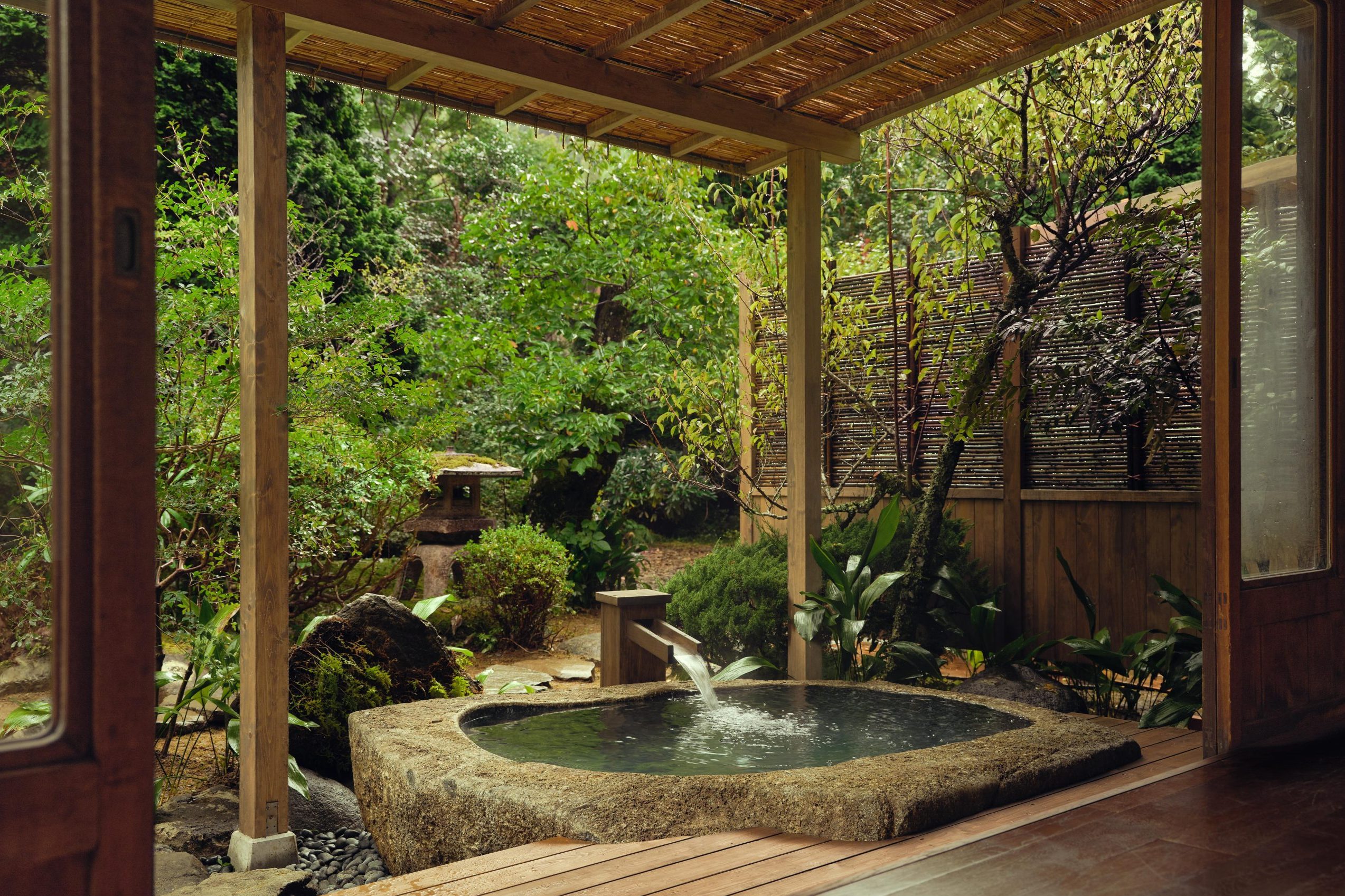Japanese-Western room (bed type) with indoor and outdoor baths fed directly from the hot spring